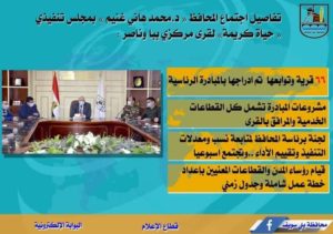 ووجه المحافظ بتشكيل لجنة برئاسته وإشراف نائبه”د.عاصم سلامة ” ومتابعة معاونه ” أ . محمد جبر ” والعقيد وفقي سعد المستشار العسكري للمحافظة وتضم رؤساء المدن القطاعات والإدارات المعنية لتشمل الإشراف على لجنة التخطيط المحلية ، على أن تجتمع أسبوعيا لمتابعة نسب ومعدلات التنفيذ حسب البرنامج الزمني المتفق عليه،ومناقشة الإجراءات المنفذة حيال تذليل المعوقات ، على أن تعرض نتائج الاجتماعات الأسبوعية على المحافظ بشكل دائم ، مع المتابعة الميدانية للمشروعات الجارية على أرض الواقع وعدم الإعتماد فقط على التقارير المكتبية