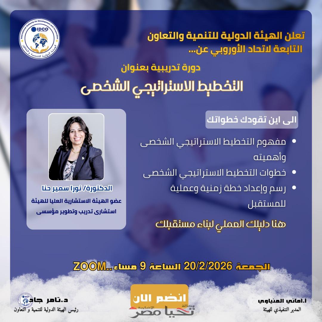 ​في إطار جهودها المستمرة لتنمية الكوادر البشرية وتعزيز مهارات القيادة الذاتية، نظمت الهيئة الدولية للتنمية والتعاون (التابعة للاتحاد الأوروبي عن…)، ندوة تدريبية متخصصة عبر تقنية “زووم” تحت عنوان “التخطيط الاستراتيجي الشخصي”، قدمتها الدكتورة نورا سمير حنا، عضو الهيئة الاستشارية العليا ومستشار التدريب والتطوير المؤسسي.