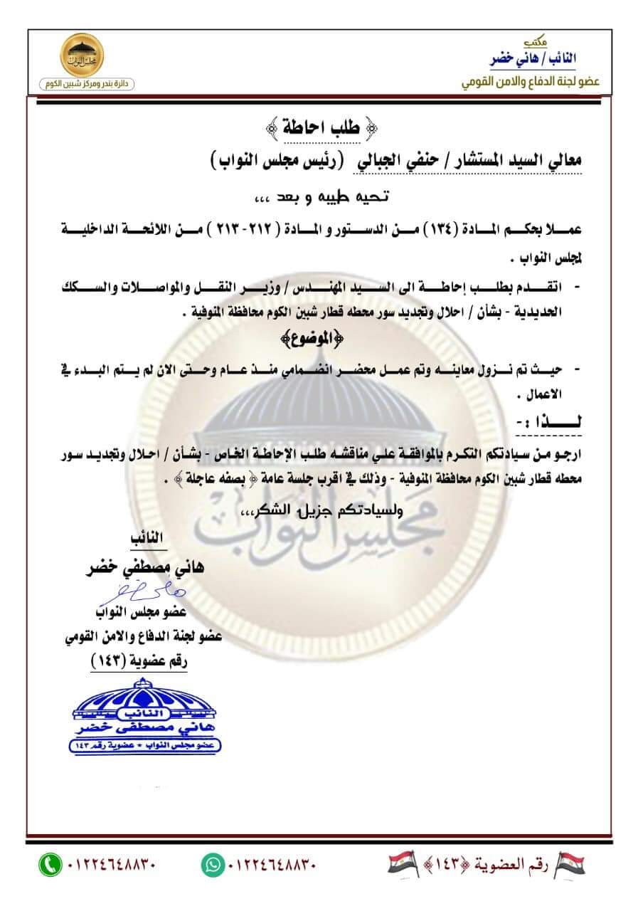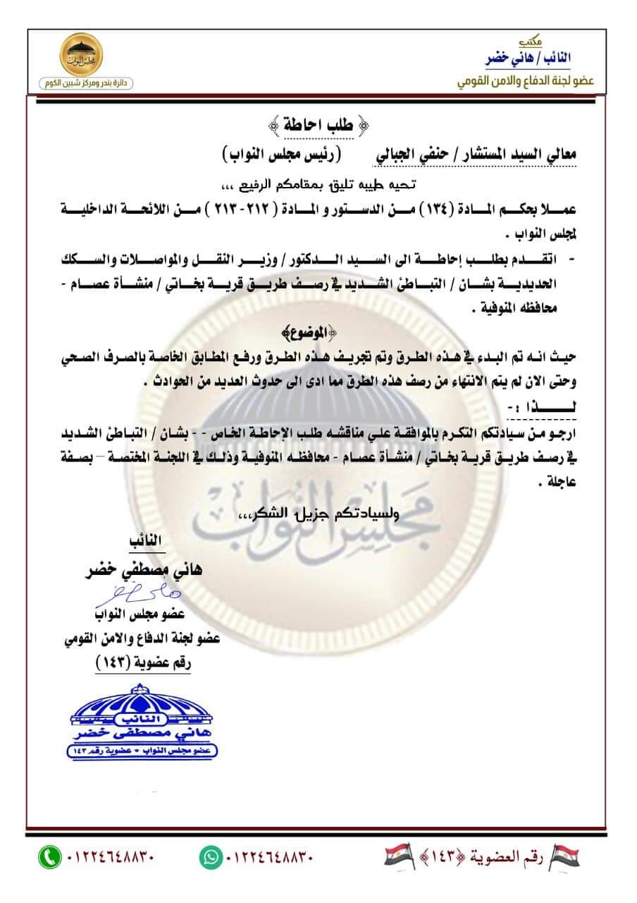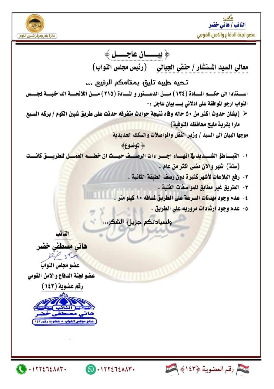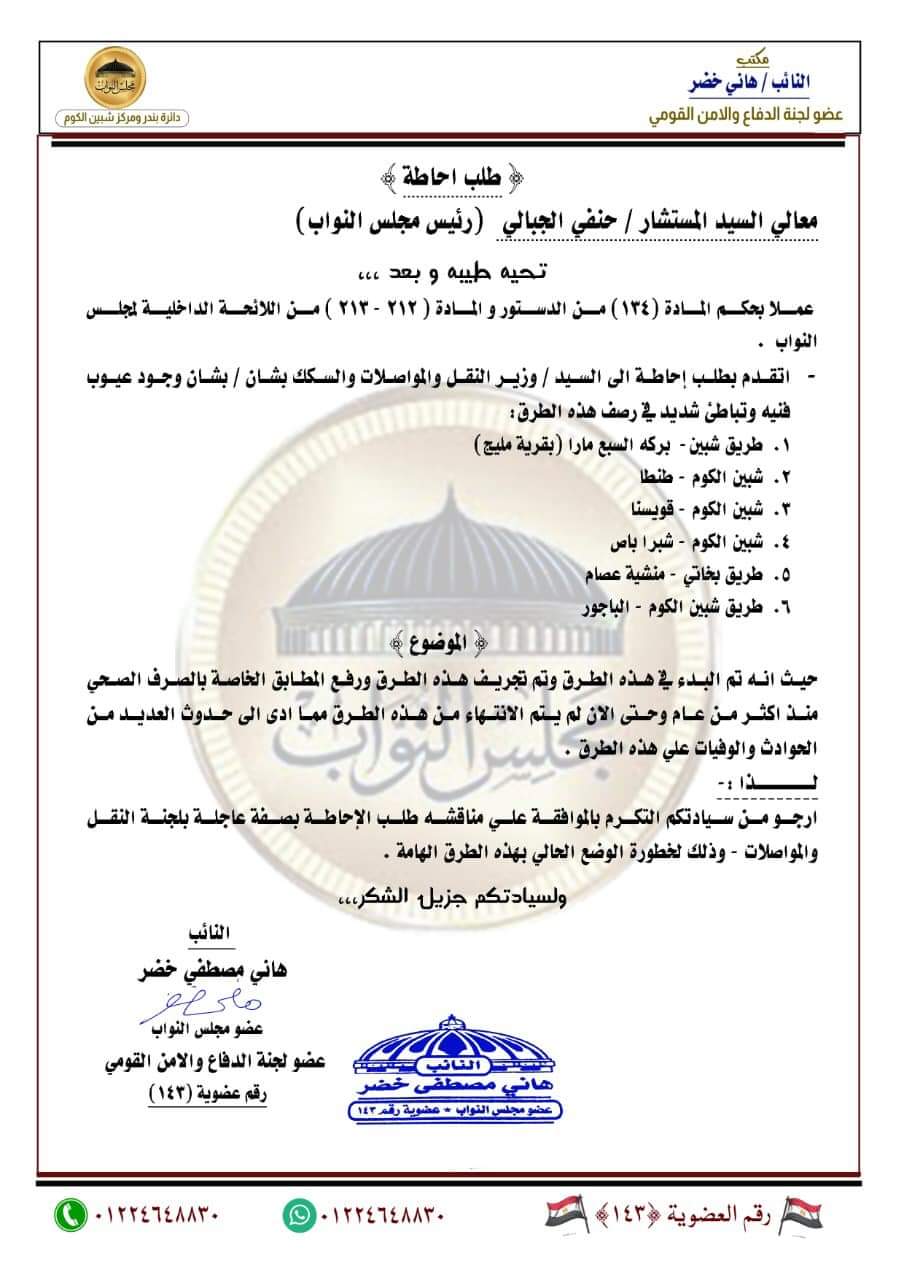 قدم  النائب هاني خضر في بداية الأنعقاد الثالث للفصل التشريعي الثاني لمجلس النواب بتقديم ٧ طلبات احاطة وبيان عاجل في وزير النقل والمواصلات ورئيس هيئة الطرق والكباري والمهندس أحمد عابد أبو الروس بسبب الأهمال والتباطؤ الشديد في أنها الطرق داخل مركز شبين الكوم مما أدي الي حدوث الكثير من الحوادث والوفيات