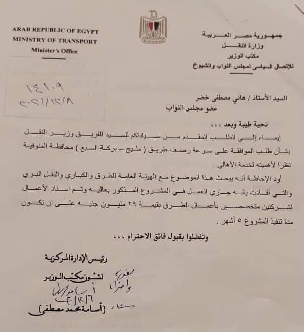 وهنا تدخل السيد المحافظ وتم عمل اجتماع بين النائب هاني خضر واللواء وحيد الحضري رئيس مجلس مدينة شبين الكوم والمهندس محمد شاهين مسئول هيئة الطرق بالمنوفيه والمهندس شعبان الشبراوي مدير مديرية الطرق والأستاذ فتحي شلبي نائب رئيس مجلس المدينة