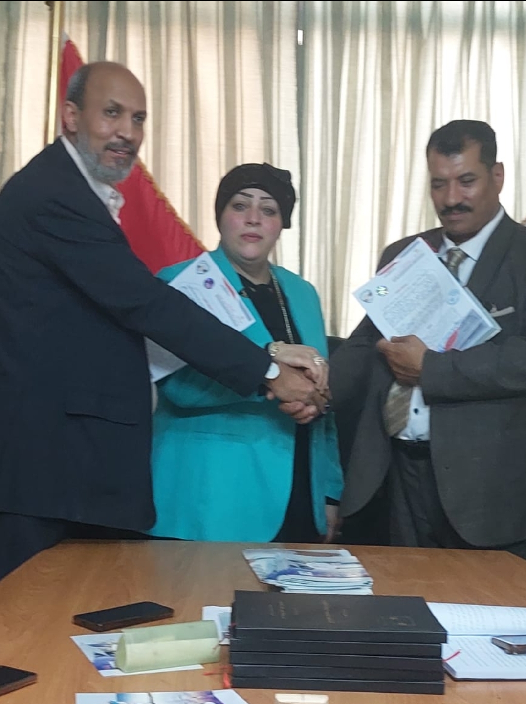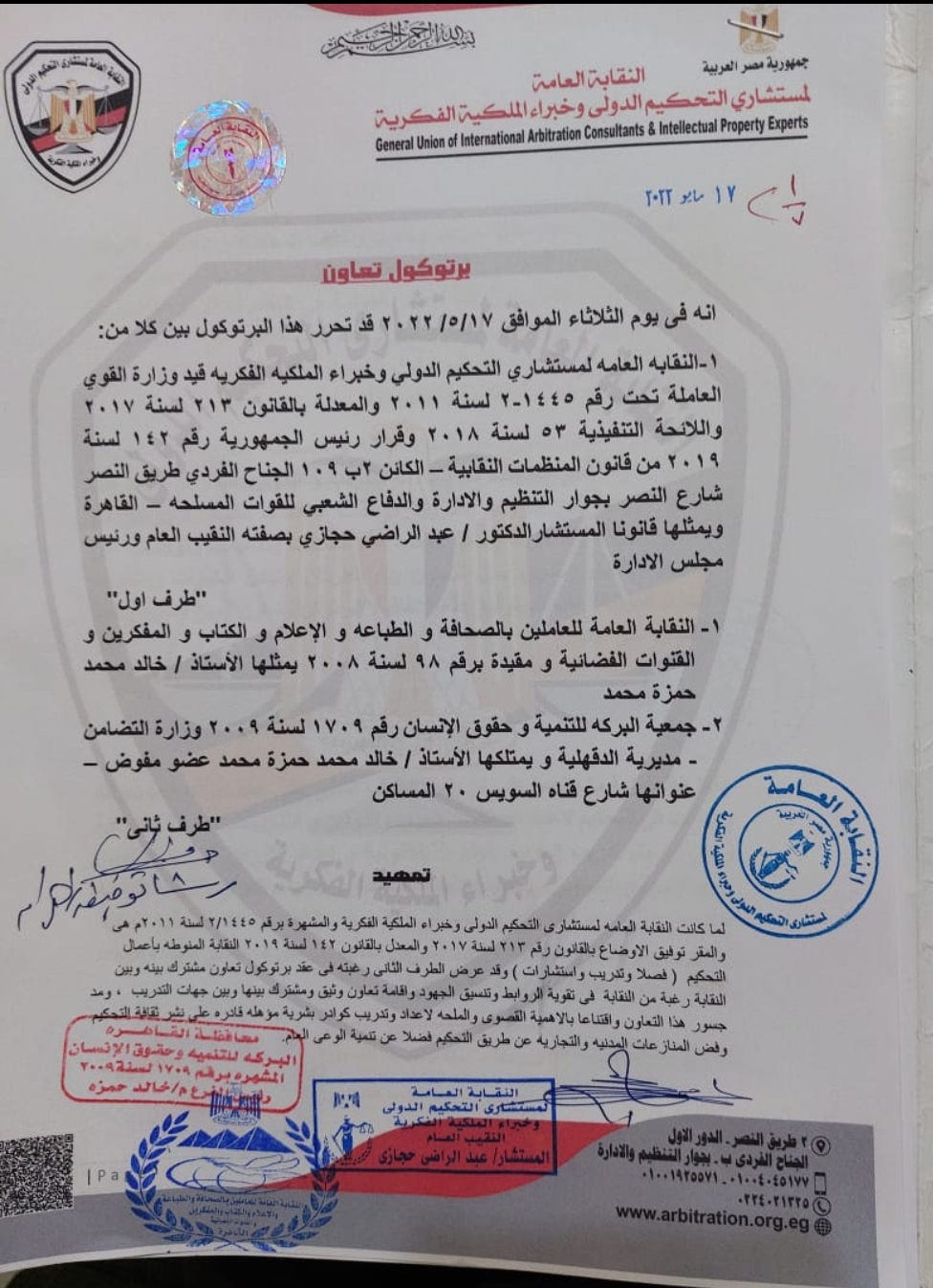 وقع البرتوكول كل من السيد الدكتور عبد الراضي حجازي النقيب العام لنقابة التحكيم والمهندس خالد حمزة