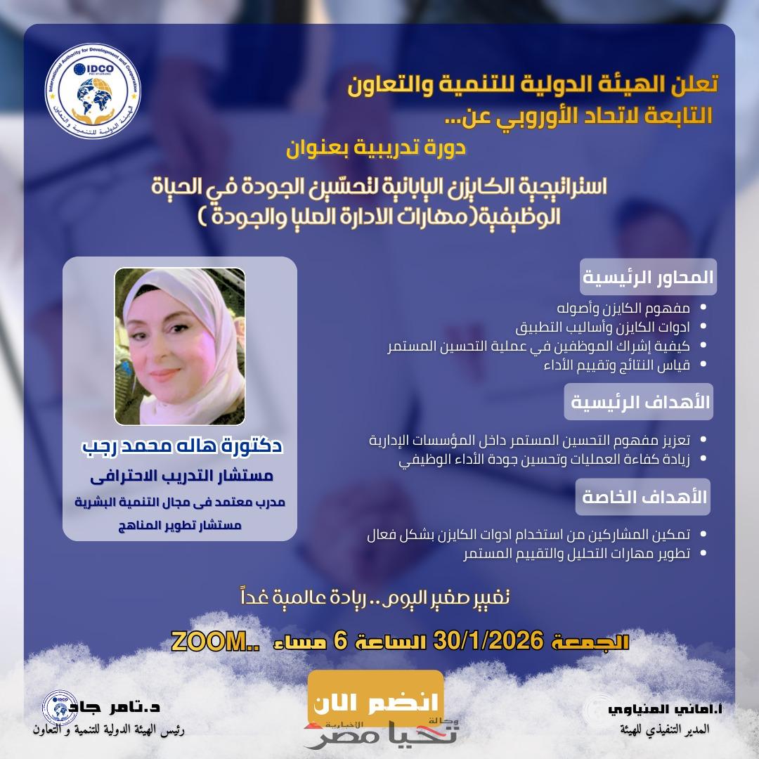 في خطوة تهدف إلى ترسيخ مفاهيم الجودة الشاملة وتطوير بيئة العمل، نظمت الهيئة الدولية للتنمية والتعاون (IDCO)، برئاسة الدكتور تامر جاد، دورة تدريبية متقدمة بعنوان: “استراتيجية الكايزن اليابانية لتحسين الجودة في الحياة الوظيفية”، قدمتها الدكتورة هالة محمد رجب، مستشار التدريب الاحترافي وتطوير المناهج.