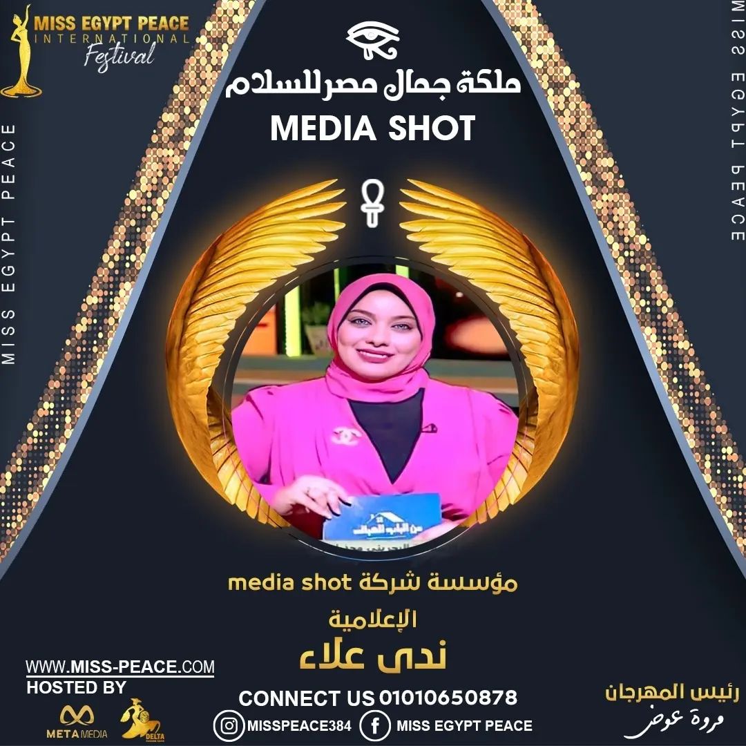 إنضمت شركة media shot للإنتاج الإعلامي إلي مهرجان ملكة جمال مصر للسلام برئاسة مصممة التيجان مروه عوض والتعاون الاعلامية ندي علاء رئيس الشركة وفريق العمل المرافق لها لتصميم الفيديوهات الخاصة بالمهرجان و جدير بالذكر ان الشركة لها اكثر من مشاركة ولها العديد من البرومومهات وغيرها من المواد الاعلامية التى شاركت بها فى اكثر من شركة ومؤسسة وهى رائده فى التصميمات الفنيى والاعلامية