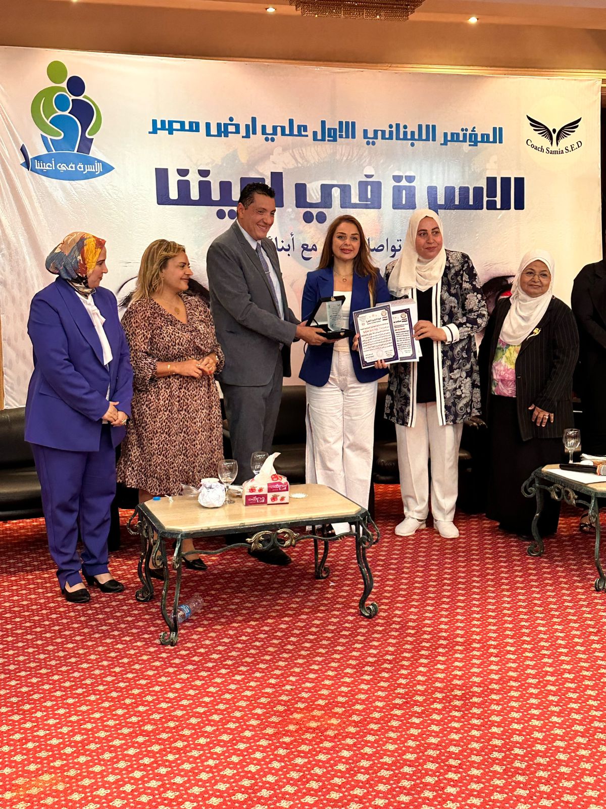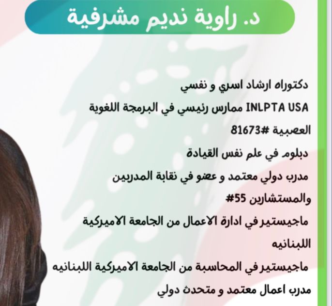 كرم المؤتمر اللبناني الأول علي أرض الحضاره مصر د راوية نديم مشرفية علي ما قدمت من بحث علمي في مجال الاسره و الطفل بعنوان الاسره في أعيننا وعن دكتورة راوية دكتوراه ارشاد اسري و نفسي INLPTA USA ممارس رئيسي في البرمجة اللغوية العصبية دبلوم في علم نفس القيادة مدرب دولي معتمد و عضو في نقابة المدربين والمستشارين ماجيستير في ادارة الاعمال من الجامعة الاميركية اللبنانيه ماجيستير في المحاسبة من الجامعة الاميركية اللبنانيه مدرب اعمال معتمد و متحدث دولي وقتلت في كلمتها في المؤتمر تعتبر الأسرة هي أول مجتمع يتعرض للتغيرات والتحديات في الحياة، ومن أهم عوامل نجاح الأسرة هو التواصل والتفاهم بين أفرادها. ولكن في بعض الأحيان يواجه الأفراد صعوبات في التواصل والتفاهم، مما يؤدي إلى تدهور العلاقات الأسرية وظهور الخلافات والصراعات. ولحل هذه المشكلات، يمكن الاستعانة بتقنيات البرمجة اللغوية العصبية.