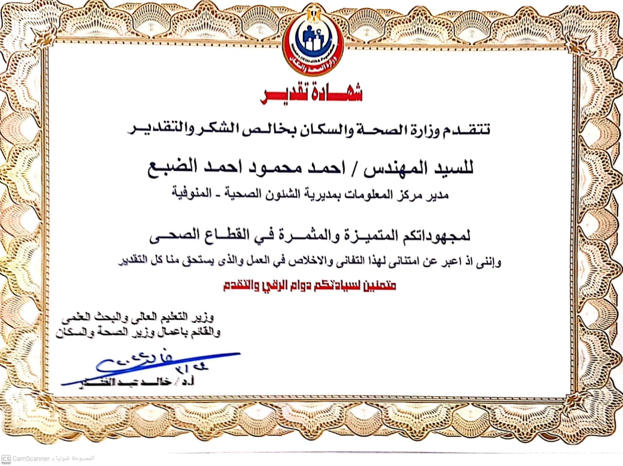 تكريم م. احمد الضبع ضمن افضل الشخصيات بمديرية الشئون الصحية بالمنوفية