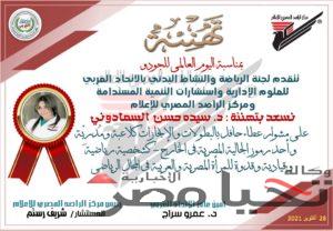 قامت لجنة الرياضة والنشاط البدني بالاتحاد العربي للعلوم الإدارية واستشارات التنمية المستدامة .. ومركز الراصد المصري للإعلام .. بتقديم تهنئة للبطلة المصرية د. سيده حسن السمادوني – على مشوار عطاء حافل بالبطولات والإنجازات كلاعبة ومُدرِّبة – وأحد رموز الجالية المصرية في الخارج – كشخصية رياضية وقيادية وقدوة للمرأة المصرية