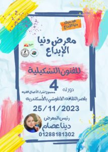 معرض دنيا الإبداع للفنون التشكيلية بنسخته الرابعه يوم السبت الموافق 25/11/2023 في القصر الثقافي الانفوشي بالأسكندريه يفتتح المعرض أ.د.عادل عبدالرحمن وكيل نقابة الفنانين التشكيليين ورئيس قطاع الفنون التشكيلية السابق أ.د علا يوسف استاذ دكتور الفنون بالجامعات المصرية والعربية وعضو المجلس الأعلى للثقافة بوزارة الثقافة ونخبه من نجوم الفن و الاعلام و الصحافه ومعانا فنانين من جميع الأعمار و مواهب فنيه مسموح بشراء الأعمال الفنيه سوف يكون في عده فقرات و الاحتفال عيد ميلاد دنيا الإبداع بمناسبه مروره عام وسوف يكون في تغطيه اعلاميه وصحافيه