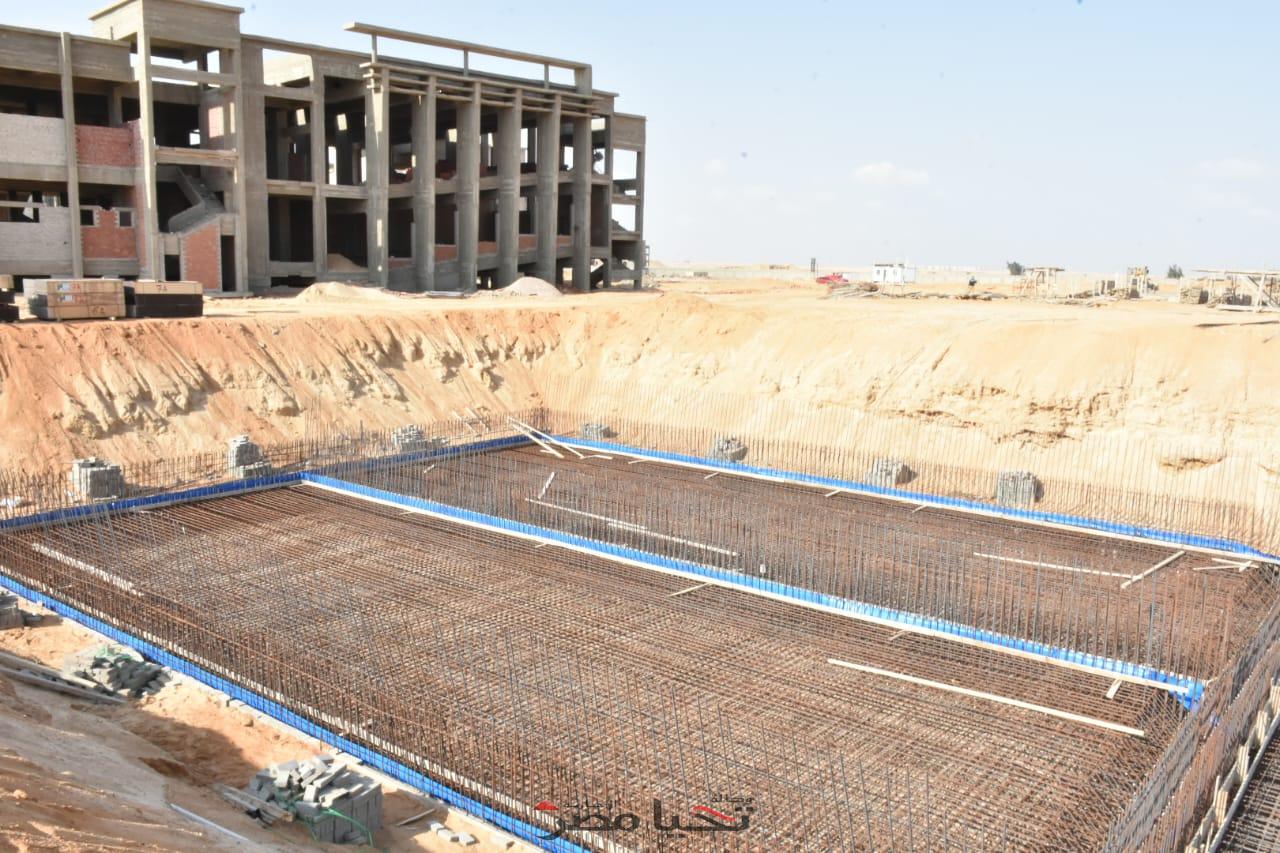 الإنشاءات الجديدة بالمقر الجديد للجامعة، للوقوف على معدلات الإنجاز الفعلية، حيث تفقدت خزان المياه الأرضى بالمشروع بحجم ٨١٠ متر مكعب لتغذية شبكات المياه والرى والحديقة لكلية التجارة ، وكذلك تفقدت أعمال البرجولات الجارى تنفيذها والمظلات المعدنية للسيارات والأتوبيسات .