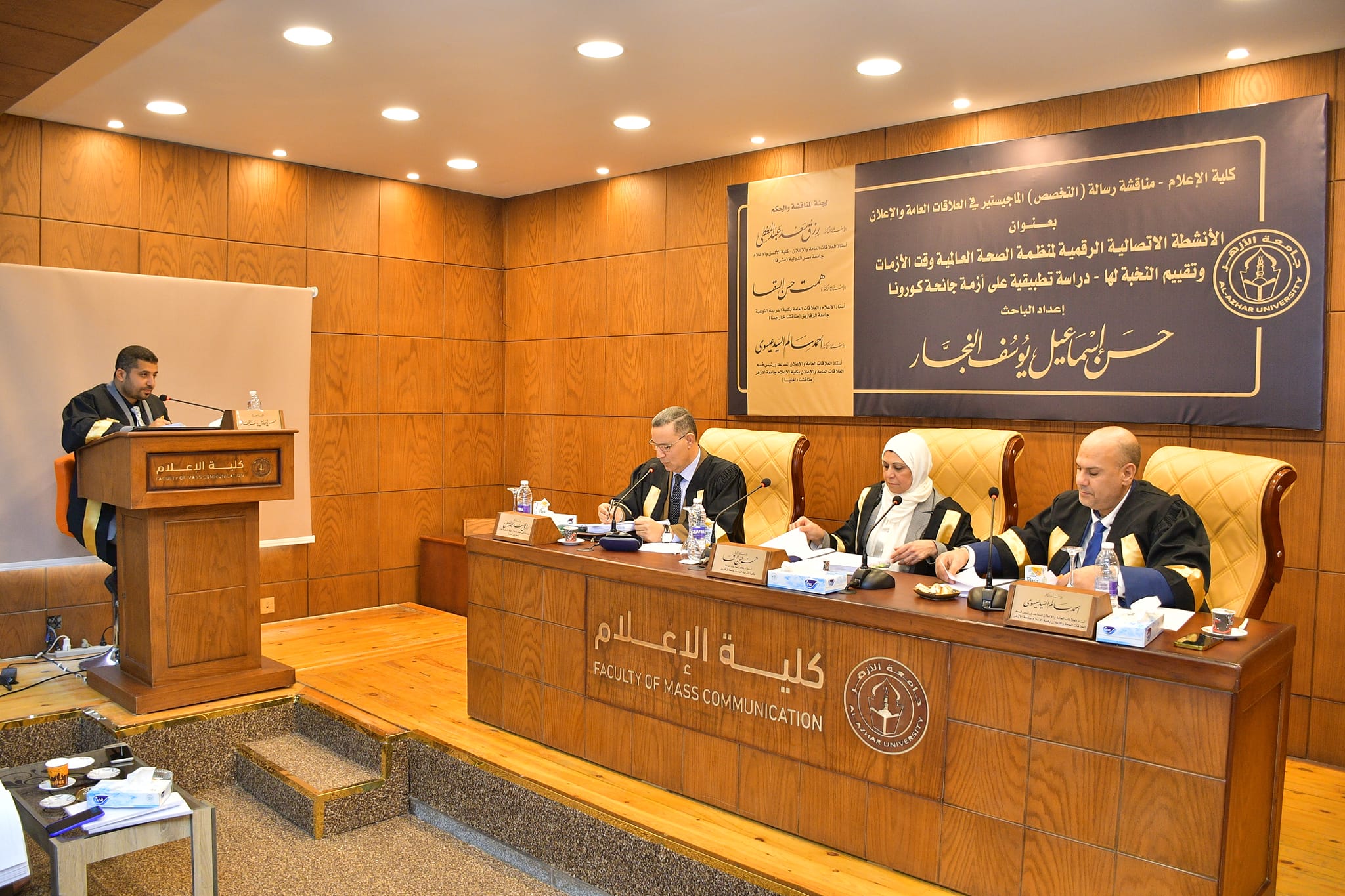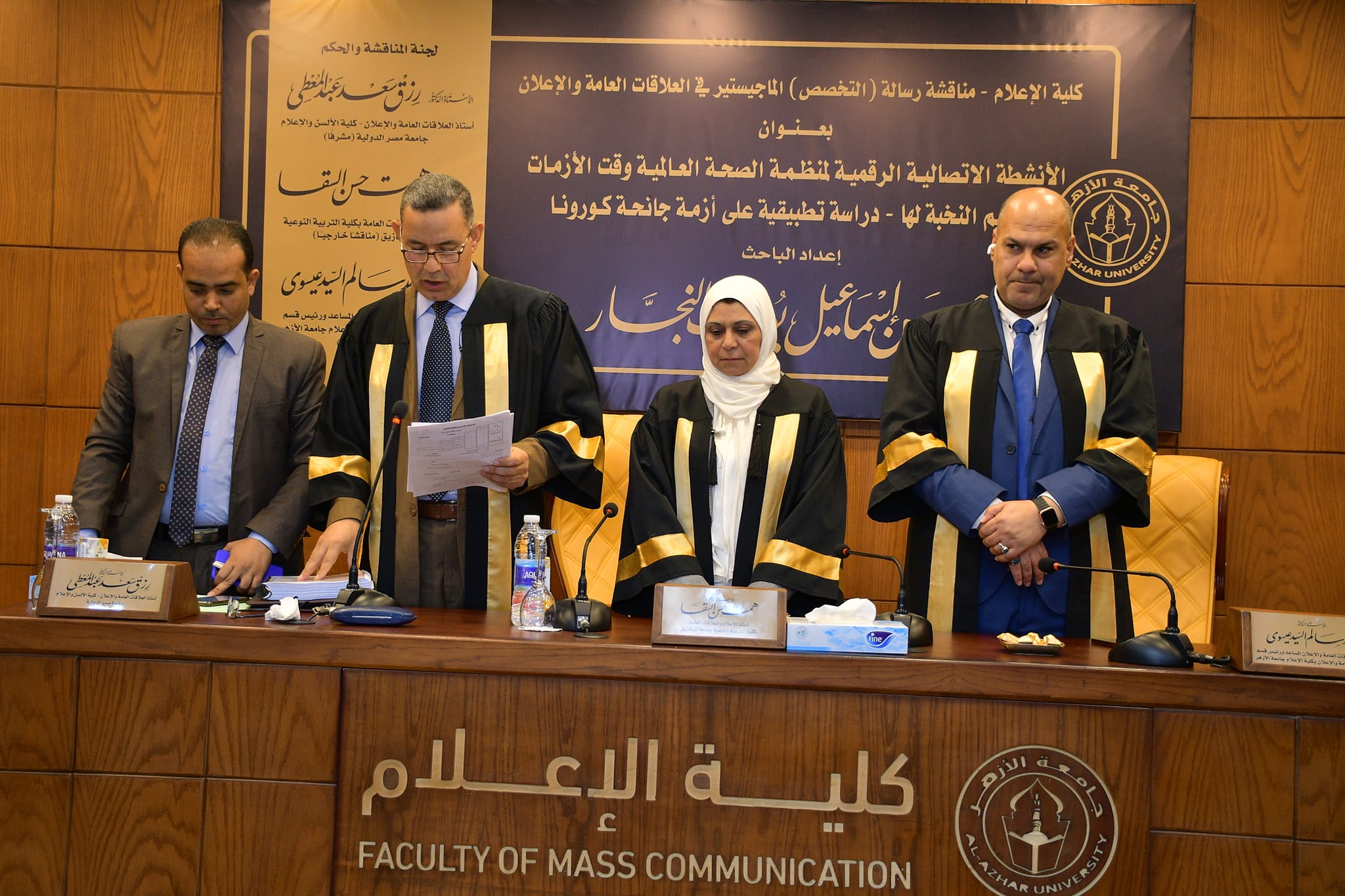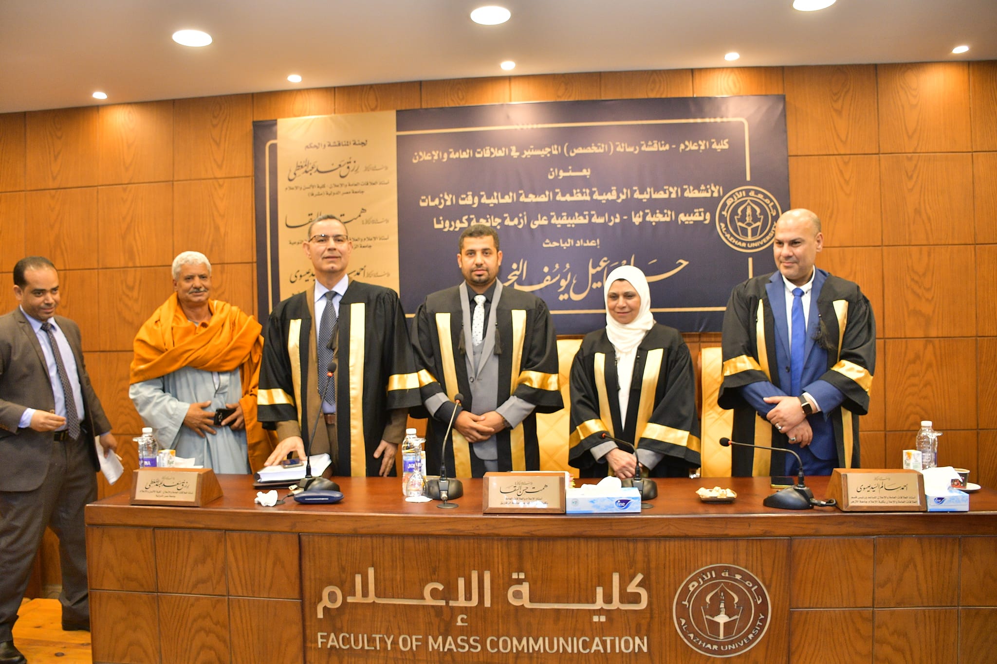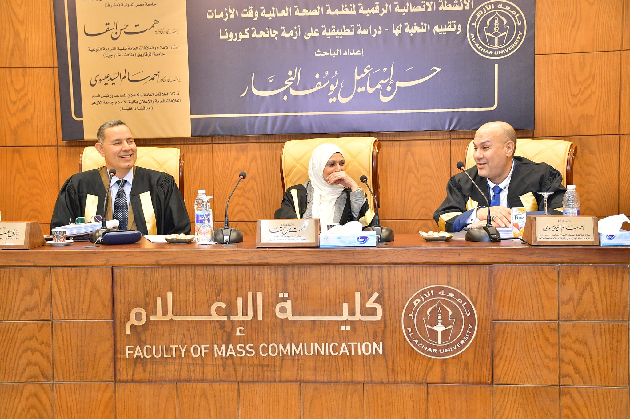 تكونت لجنة المناقشة والحكم من الأستاذة الدكتورة همت السقا أستاذ العلاقات العامة والإعلان بكلية التربية النوعية جامعة الزقازيق مناقشا خارجيا، سعادة الأستاذ الدكتور رزق سعد أستاذ العلاقات والإعلان بكلية الإعلام جامعة مصر الدولية مشرفا رئيسا، سعادة الأستاذ الدكتور أحمد سالم رئيس قسم العلاقات العامة والإعلان بكلية الإعلام جامعة الأزهر مناقشا داخليا.
