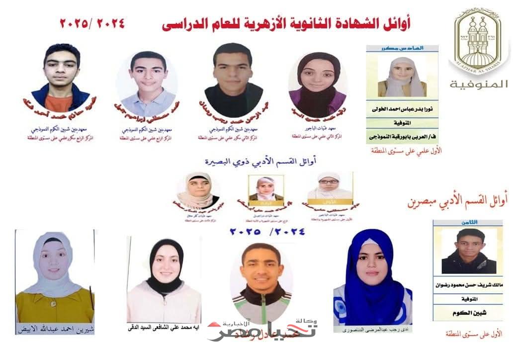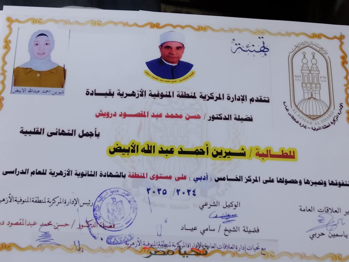 وبهذا، تثبت المنوفية الأزهرية مجددًا أنها قلعة للعلم، ومصنع لأوائل الجمهورية، حيث تتلألأ أسماء مثل شيري