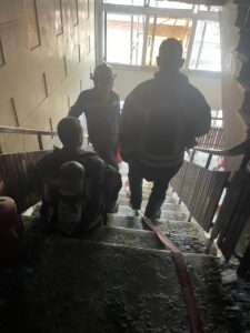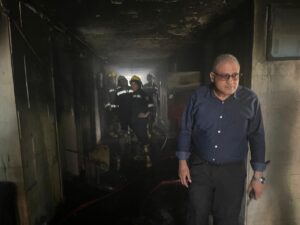 تبين أثناء تفقد الأدوار الداخلية للأكاديمية وجود حريق داخل المبنى الإدارى بالجامعة (مكون من أرضى و ٣ طوابق) فالطابق الأرضى خاص بكلية اللغات و الترجمة و به حوالي ٥٠ طالب و تم الاخلاء خاصة بالشئون الإدارية، وامتد الحريق للطابق الثانى داخل المكتب الخاص بمعامل الحاسبات و المعلومات و تلفيات في الشباك الخارجي .