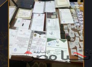 عقب تقنين الإجراءات بالتنسيق مع قطاع الأمن العام ومديرية أمن الدقهلية تم إستهداف المتهم المذكور حيث أمكن ضبطه وبتفتيش مقر المكتبة عُثر بداخلها على (طبنجة صوت – سلاح أبيض – خاتم شعار الجمهورية “مزور” – أكلاشيهات “مزورة” – عدد 2 جهاز “لاب توب ، حاسب آلى” يستخدمهما فى تزوير المستندات والمحررات الرسمية من خلال برامج مُحملة عليهما – ماكينة تصوير مستندات تستخدم فى طباعة المستندات المزورة – ماسح ضوئى – 2 ذاكرة نقالة “فلاش ميمورى”– مجموعة من الورق لتغليف الكارنيهات بعد تزويرها – 20 بصمة خاتم شعار الجمهورية “مزور” – 11 بصمة أكلاشية “مزور” – كمية كبيرة من الورق مخصصة للتزوير – شهادات بأسماء أشخاص مزورة – خطابات وعقود تنازل “معدة للتزوير” – كارنيهات مزورة بأسماء أشخاص مختلفة – 2 هاتف محمول) بفحص الهواتف فنياً تبين أنهما مُحملان بالعديد من المحادثات على تطبيقات المحادثات وبين العديد من عملائه تدل على نشاطه المؤثم – مبلغ مالى من حصيلة نشاطه الإجرامى – وبفحص أجهزة الحاسب الآلى والفلاش ميمورى تبين أنها تحتوى على (نماذج أختام شعار الجمهورية المقلدة المنسوبة لعدد من الجهات الحكومية المختلفة – المستندات والمحررات المزورة ) وبمواجهة المتهم أقر بممارسة نشاطه الإجرامى على النحو المشار إليه وإستخدام أجهزة الحاسب الآلى المضبوطة فى تزوير المحررات الرسمية .