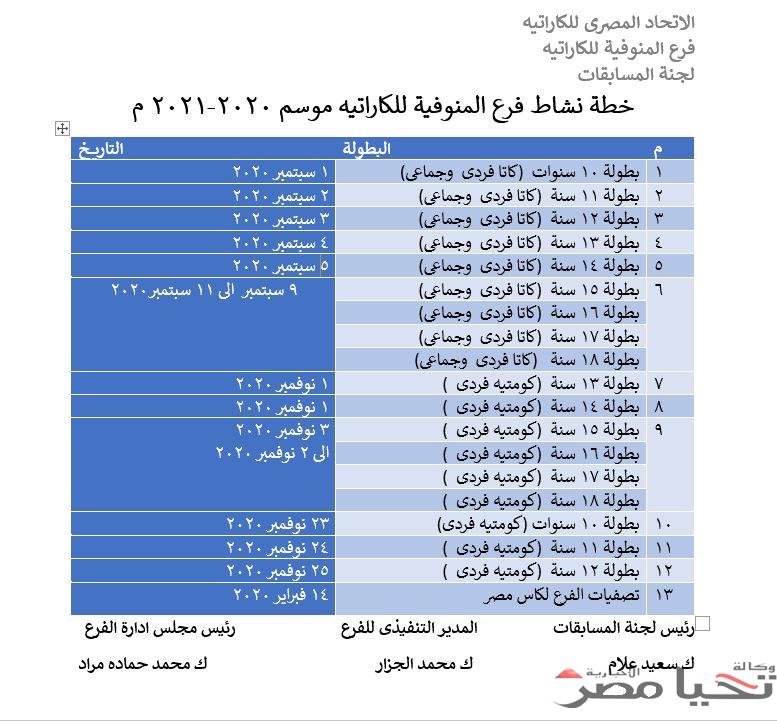 تحت رعايه الاستاذ محمد الدهراوي رئيس الاتحاد المصري للكارتيه ونائب الاتحاد العربي يستعد فرع المنوفيه للكارتيه برئاسه كابتن محمد حماده وبرئاسه لجنه المسابقات كابتن سعيد علام  والمدير التنفيذى للفرع كابتن محمد الجزار  خطه محافظه المنوفيه لنشاط الكارتيه 2020/2021 لبطوله المحافظه على يبدا النشاط بدايه من 1/9 القادم  و اكد الاستاذ عمر يسرى ان  اخر موعد لتسجيل بطولة المحافظة للمراحل السنية من ١٠ إلى ١٤سنة …كاتا فردى وجماعى…..هو يوم ٣٠ اغسطس ٢٠٢٠ ….مع اطيب الامنيات بالتوفيق للجميع.