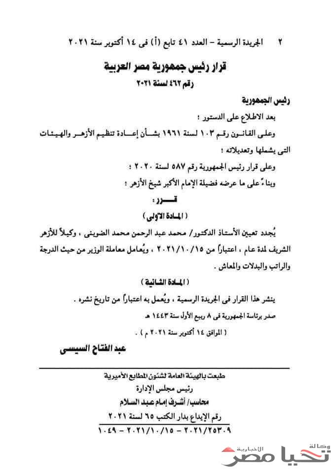 أصدر الرئيس عبد الفتاح السيسى،رئيس الجمهورية، القرار رقم 462 لسنة 2021، بتجديد تعيين الأستاذ الدكتور محمد عبد الرحمن محمد الضويني، وكيلًا للأزهر الشريف لمدة عام، اعتبارًا من 15 أكتوبر الجارى.