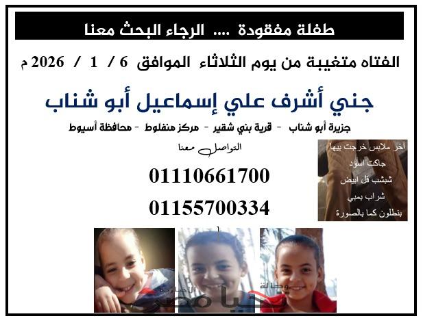 ناشدت أسرة الطفلة جنى أشرف علي إسماعيل أبو شناب، أهالي محافظة أسيوط وجميع المواطنين، المساعدة في البحث عنها بعد اختفائها منذ يوم الثلاثاء الموافق 6 / 1 / 2026، من نطاق قرية بني شقير – مركز منفلوط – محافظة أسيوط.