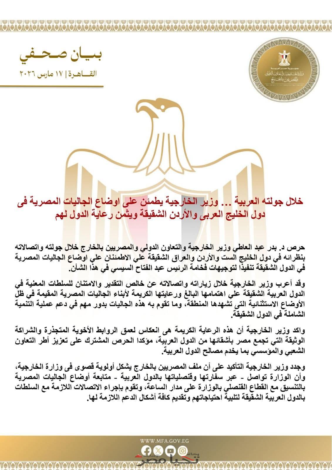 بيان صادر عن وزارة الخارجية والتعاون الدولي والمصريين بالخارج: