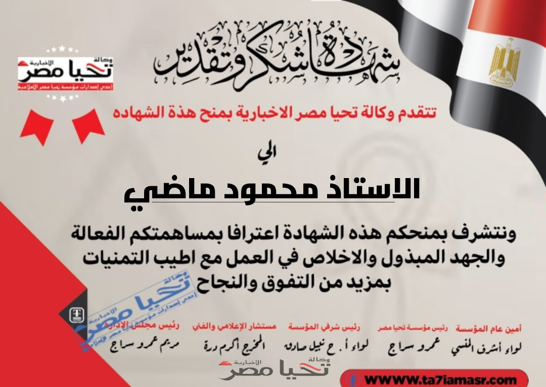 وجاء في نص الشهادة أن وكالة تحيا مصر الإخبارية تتشرف بمنح هذه الشهادة للأستاذ محمود ماضي، اعترافًا بمساهماته الفعالة والجهد المبذول والإخلاص في العمل، مع خالص التمنيات له بمزيد من التفوق والنجاح في مسيرته العلمية والمهنية.