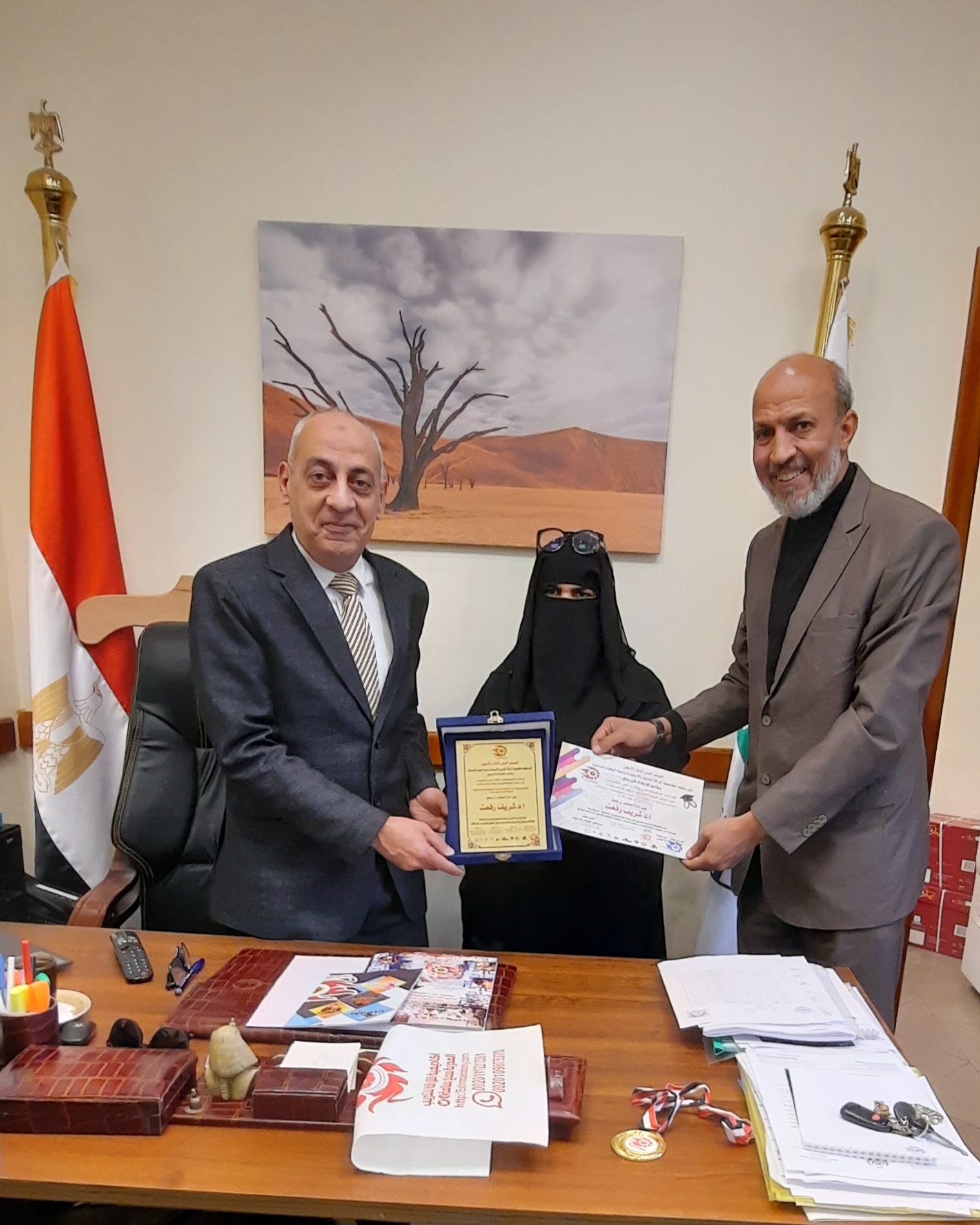 وقبل مغادرة الجامعة تم اهدائه درع وقلادة المؤتمر من قبل دكتورة سماح سلامة