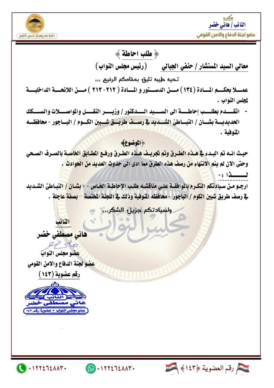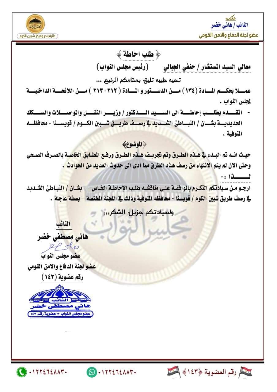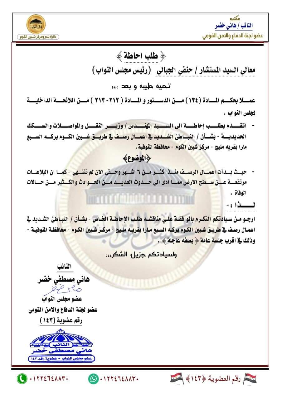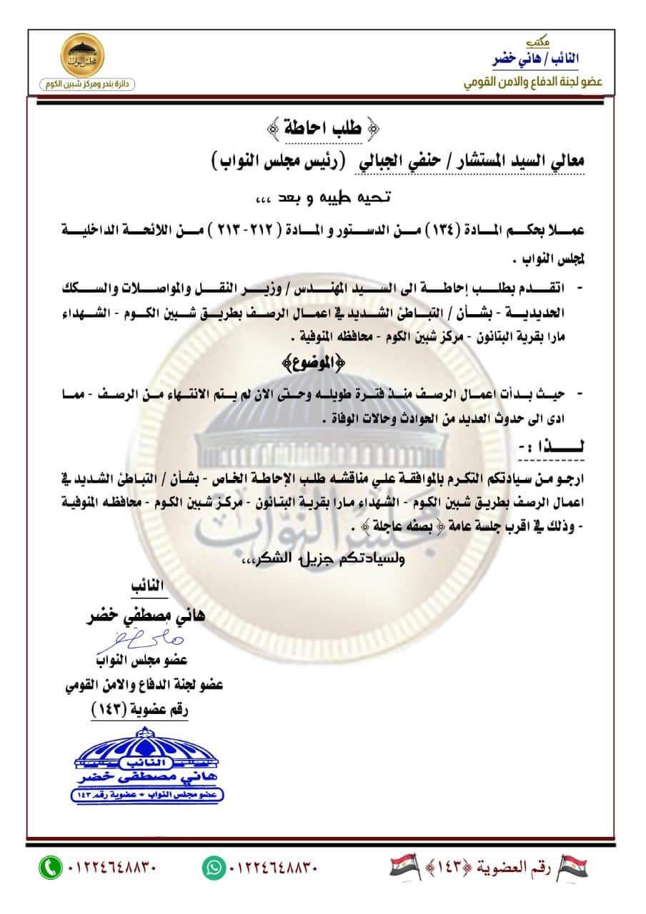 قدم النائب هاني خضر في بداية الأنعقاد الثالث للفصل التشريعي الثاني لمجلس النواب بتقديم ٧ طلبات احاطة وبيان عاجل في وزير النقل والمواصلات ورئيس هيئة الطرق والكباري والمهندس أحمد عابد أبو الروس بسبب الأهمال والتباطؤ الشديد في أنها الطرق داخل مركز شبين الكوم مما أدي الي حدوث الكثير من الحوادث والوفيات