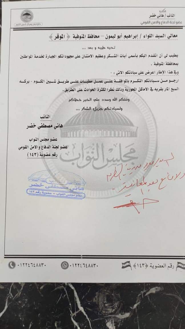وهنا تدخل السيد المحافظ وتم عمل اجتماع بين النائب هاني خضر واللواء وحيد الحضري رئيس مجلس مدينة شبين الكوم والمهندس محمد شاهين مسئول هيئة الطرق بالمنوفيه والمهندس شعبان الشبراوي مدير مديرية الطرق والأستاذ فتحي شلبي نائب رئيس مجلس المدينة