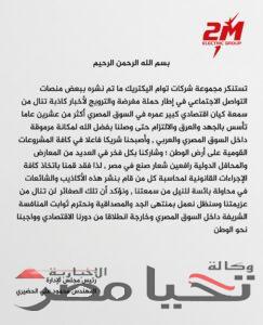 ردت مجموعة شركات تو ام اليكتريك برئاسة المهندس محمود علي الحضيري رئيس مجلس الإدارة، علي ما تم نشره ببعض منصات التواصل الاجتماعي، ببيان قوي، حصل الموقع علي نسخه منه، وذلك علي اثر تعرضها لحملة مغرضة والترويج لأخبار كاذبة تنال من سمعة كيان اقتصادي كبير عمره في السوق المصري أكثر من عشرين عاما، تأسس بالجهد والعرق والالتزام حتى وصل بفضل الله لمكانة مرموقة داخل السوق المصري والعربي.