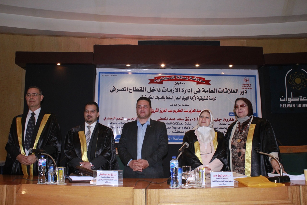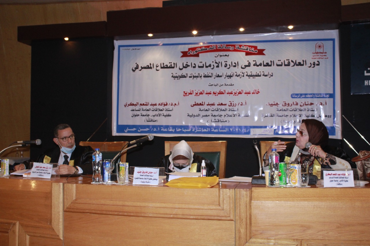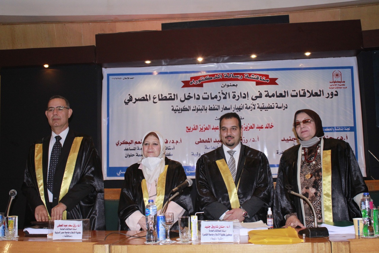 وتكونت لجنة المناقشة والحكم من الأستاذة الدكتورة حنان جنيد أستاذ العلاقات العامة والإعلان ووكيل كلية الإعلام جامعة القاهرة؛ والأستاذ الدكتور رزق سعد أستاذ العلاقات العامة والإعلان بكلية الإعلام جامعة مصر الدولية، والأستاذة الدكتورة فؤادة البكري أستاذ العلاقات العامة والإعلان بقسم الإعلام كلية الآداب جامعة حلوان وقد هدفت الدراسة إلى التعرف على طبيعة الأزمات التى تواجه مؤسسات البنوك الكويتية (عينة الدراسة) ومدى مساهمة العلاقات العامة فى مواجهتها، والتعرف على مستوى وعى العاملين فى مجال العلاقات العامة بالبنوك عينة الدراسة (البنك الأهلى الكويتى، بيت التمويل الكويتى، بنك الكويت المركزى) بمفهوم الأزمة والأساليب العلمية لإدارة الأزمة.