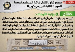 انتشر في بعض المواقع الإلكترونية وصفحات التواصل الاجتماعي أنباء بشأن صدور قرار بإغلاق كافة المساجد تحسباً للموجة الثانية لفيروس كورونا، وقد قام المركز الإعلامي لمجلس الوزراء بالتواصل مع وزارة الأوقاف، والتي نفت تلك الأنباء، مُؤكدةً أنه لا صحة لصدور أي قرارات بإغلاق كافة المساجد، مُشددةً على أن قرار فتح المساجد لكافة الصلوات مازال سارياً دون تغيير وتحت إشراف مديريات الأوقاف بكل محافظة، مُشيرةً إلى الالتزام التام بتطبيق كافة التدابير الاحترازية والوقائية، مع استمرار حملات نظافة وتعقيم جميع المساجد، كما يتم اتخاذ إجراءات حاسمة تجاه من تثبت مخالفته من المكلفين بمتابعة تنفيذ الإجراءات أو تهاونه في تطبيقها.